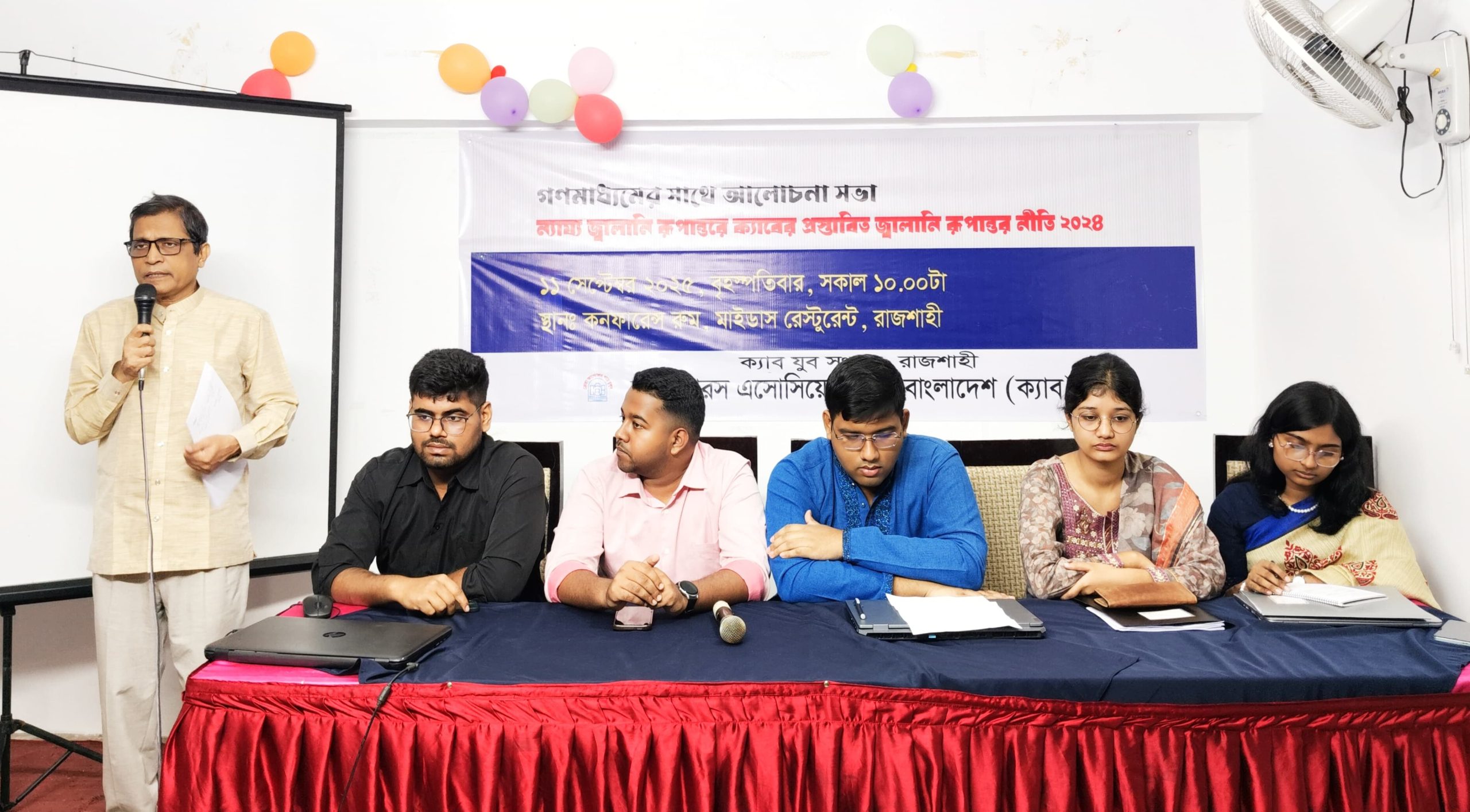 অনুষ্ঠানে সভাপতিত্ব করেন ক্যাব যুব সংসদ রাজশাহীর সভাপতি মো. জুলফিকার আলী। প্রধান অতিথি ছিলেন ক্যাবের জ্বালানি উপদেষ্টা অধ্যাপক ড. এম শামসুল আলম। প্রধান অতিথির বক্তব্যে শামসুল আলম বলেন, “জ্বালানি খাতে স্বচ্ছতা ও জবাবদিহি নিশ্চিত করতে হবে। নীতি সহায়তা, ন্যায্য মূল্যহার ও বেসরকারি বিনিয়োগ একসাথে কাজ করলে বাংলাদেশও উন্নত দেশের মতো টেকসই জ্বালানি নিরাপত্তা অর্জন করতে পারবে।”