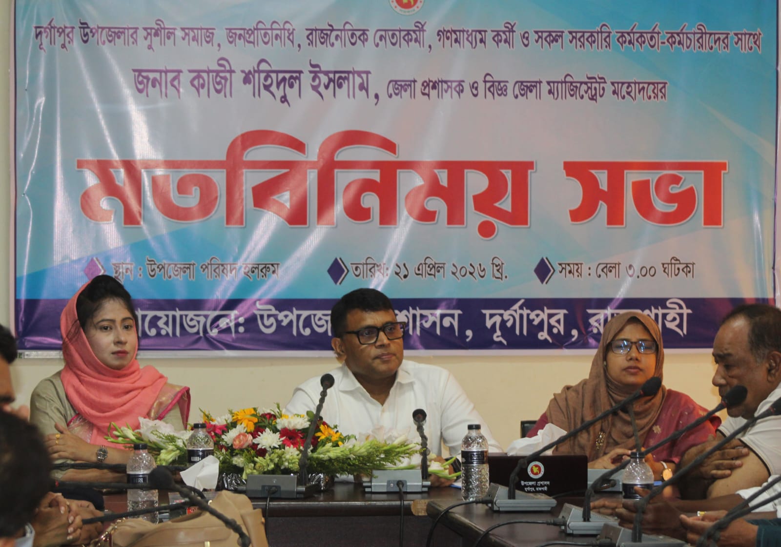 মঙ্গলবার (২১ এপ্রিল) বিকেল ৩টায় উপজেলা প্রশাসনের আয়োজনে দুর্গাপুর উপজেলা পরিষদ সভাকক্ষে এ মতবিনিময় সভা অনুষ্ঠিত হয়। উপজেলা নির্বাহী কর্মকর্তা মাশতুরা আমিনার সভাপতিত্বে ও সঞ্চালনায় সভায় বিভিন্ন গুরুত্বপূর্ণ বিষয়ে আলোচনা হয় এবং অংশগ্রহণকারীরা নিজেদের মতামত তুলে ধরেন।